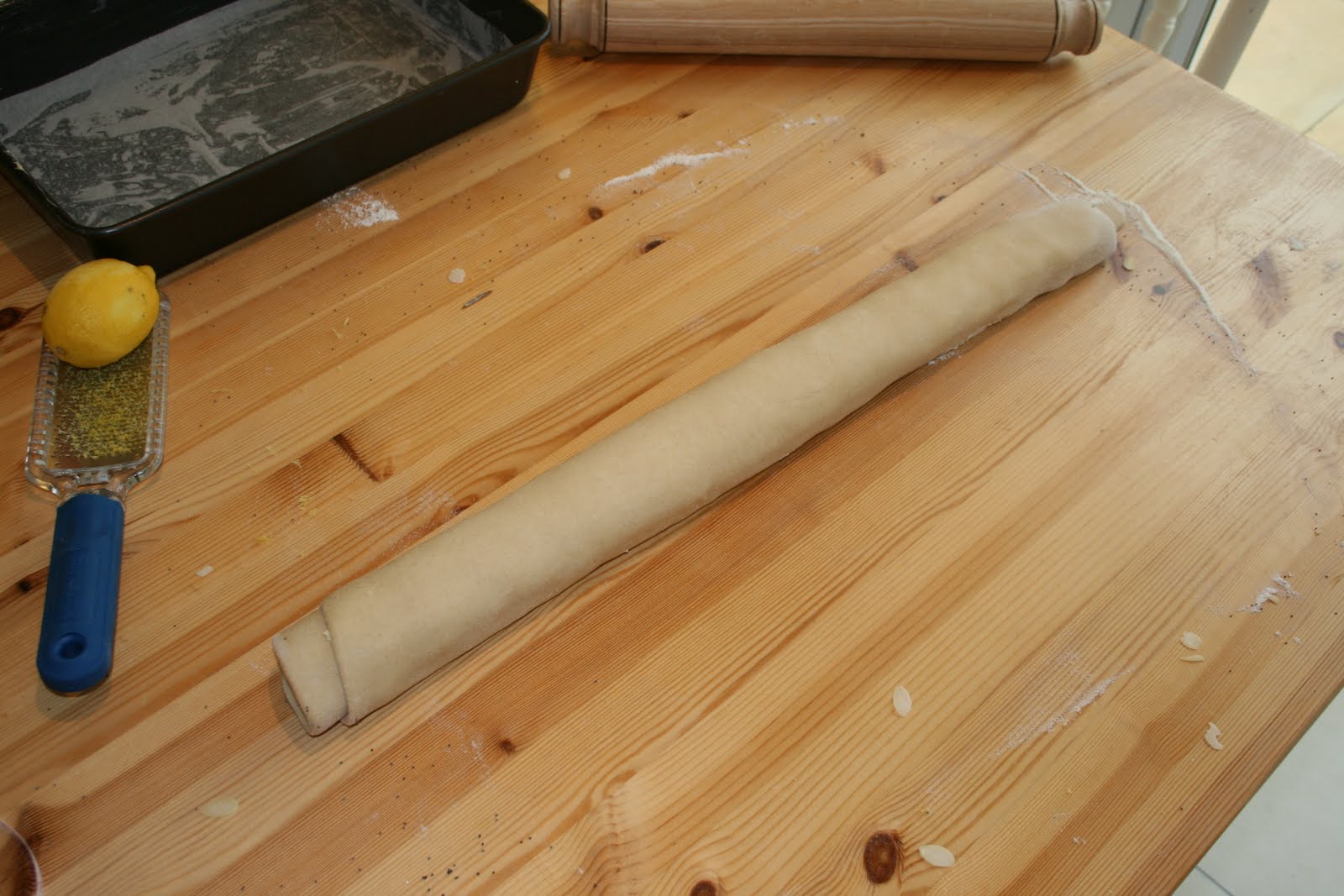 After the dough had doubled in size, I rolled it out to 50cm by 40cm and spread a thin layer of frangipane followed by a handfull of flaked almonds, the zest of two lemons and a scattering of poppy seeds before rolling it up tightly and dividing it into 16 slices. I lined my tin again as per the Cinnamon Bun post as I find it makes it easier to take out of the tin.
